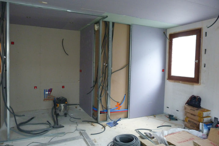 Réalisation d'une étagère placo dans l'angle de la pièce principale.