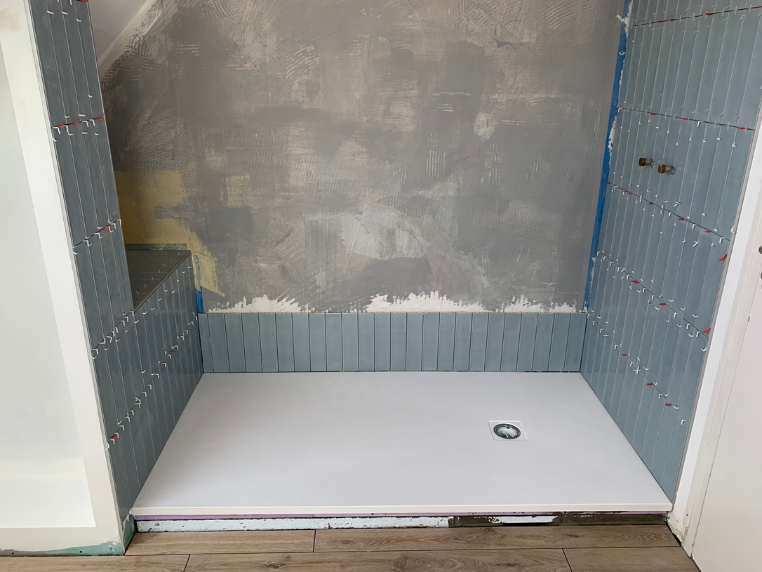 Une structure placo en bout de douche carrelée avec des carreaux imitation Zellige